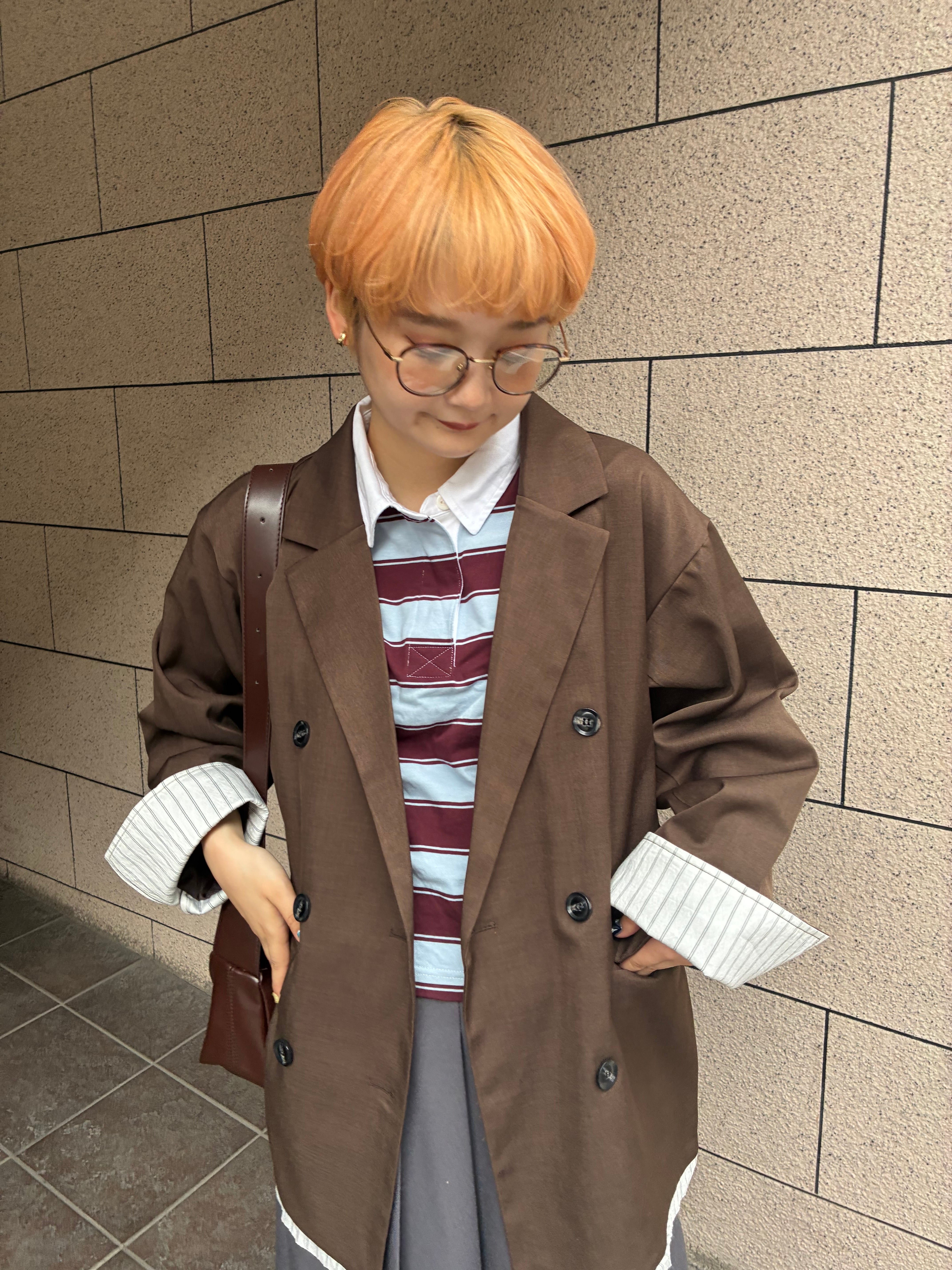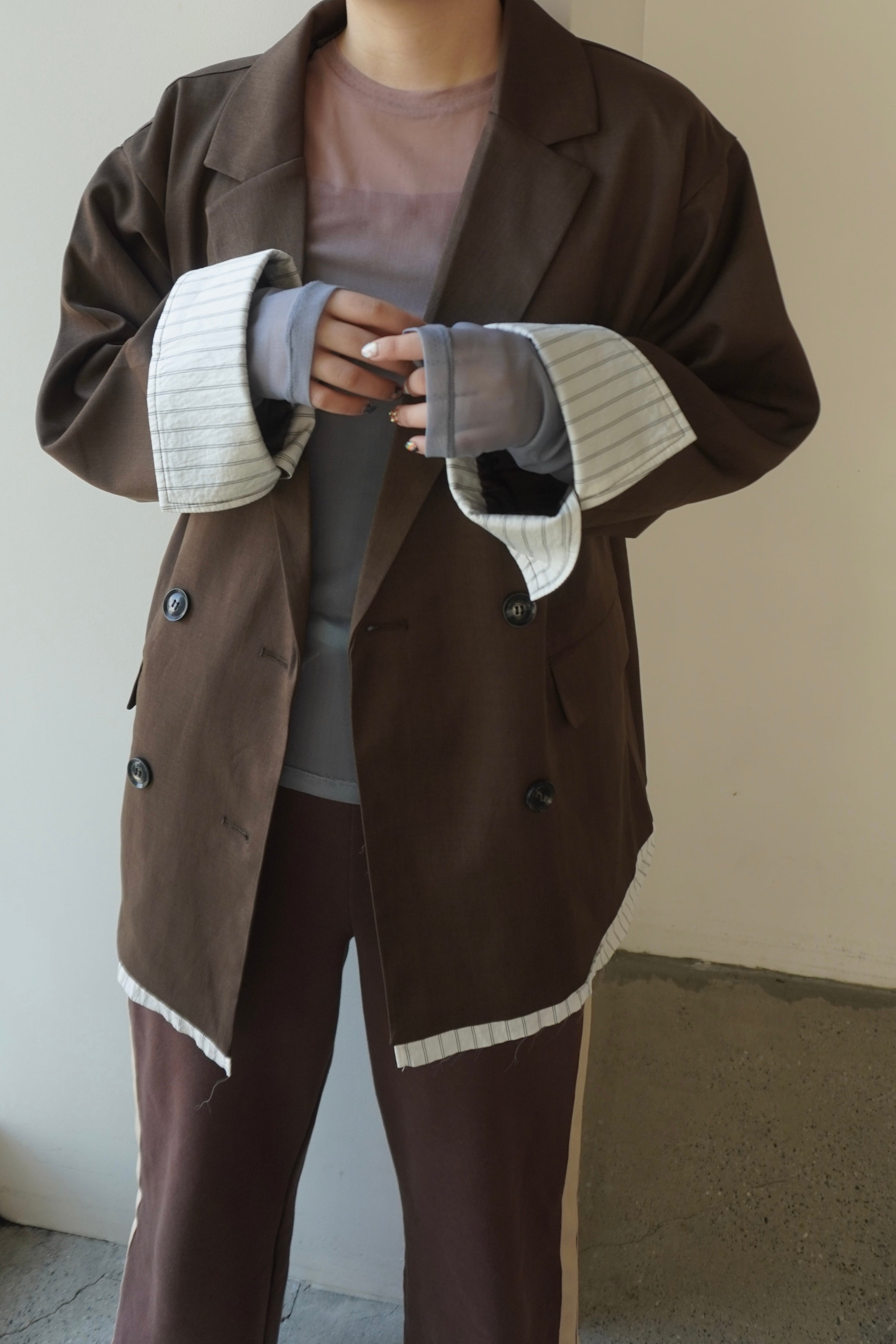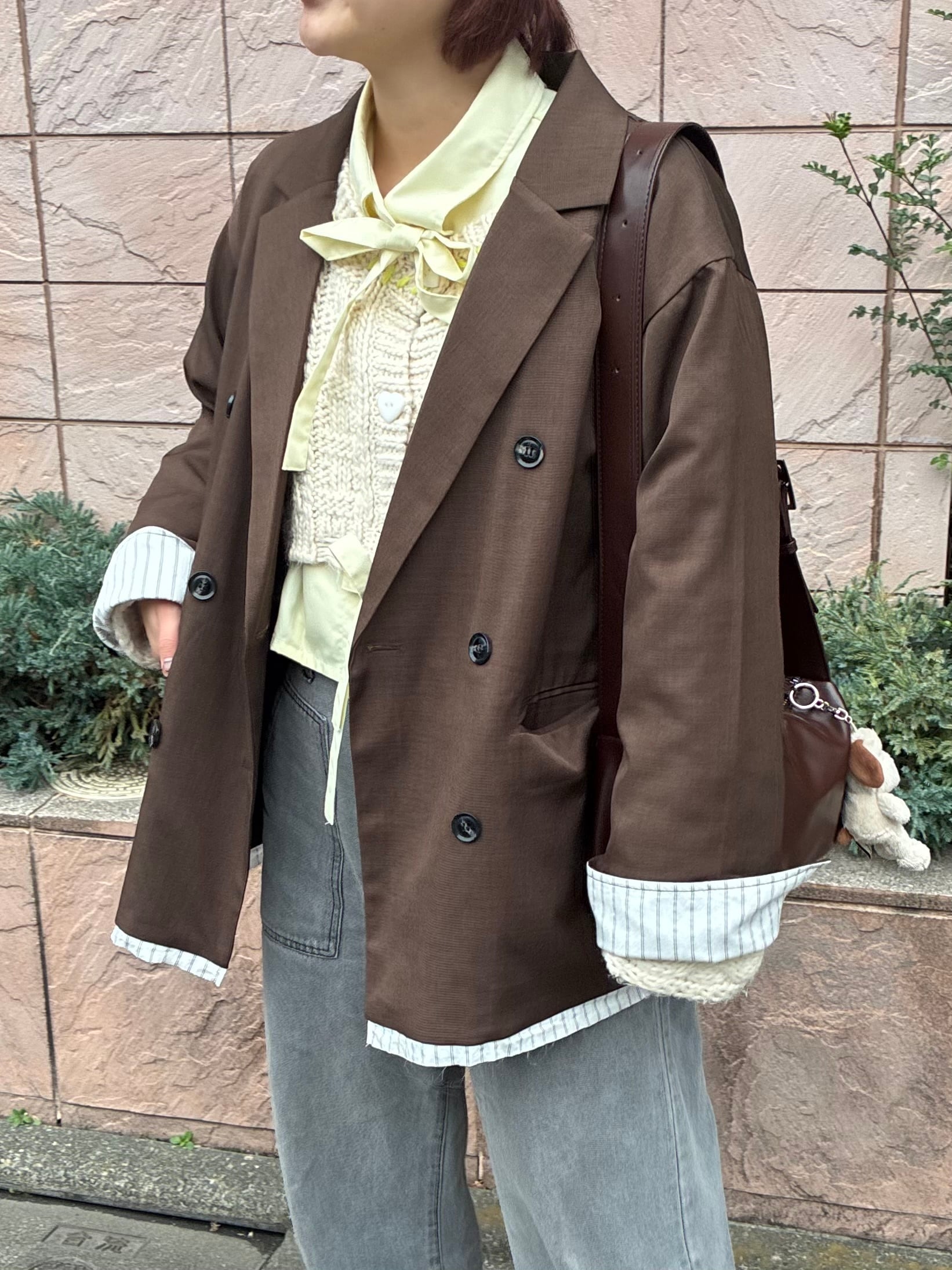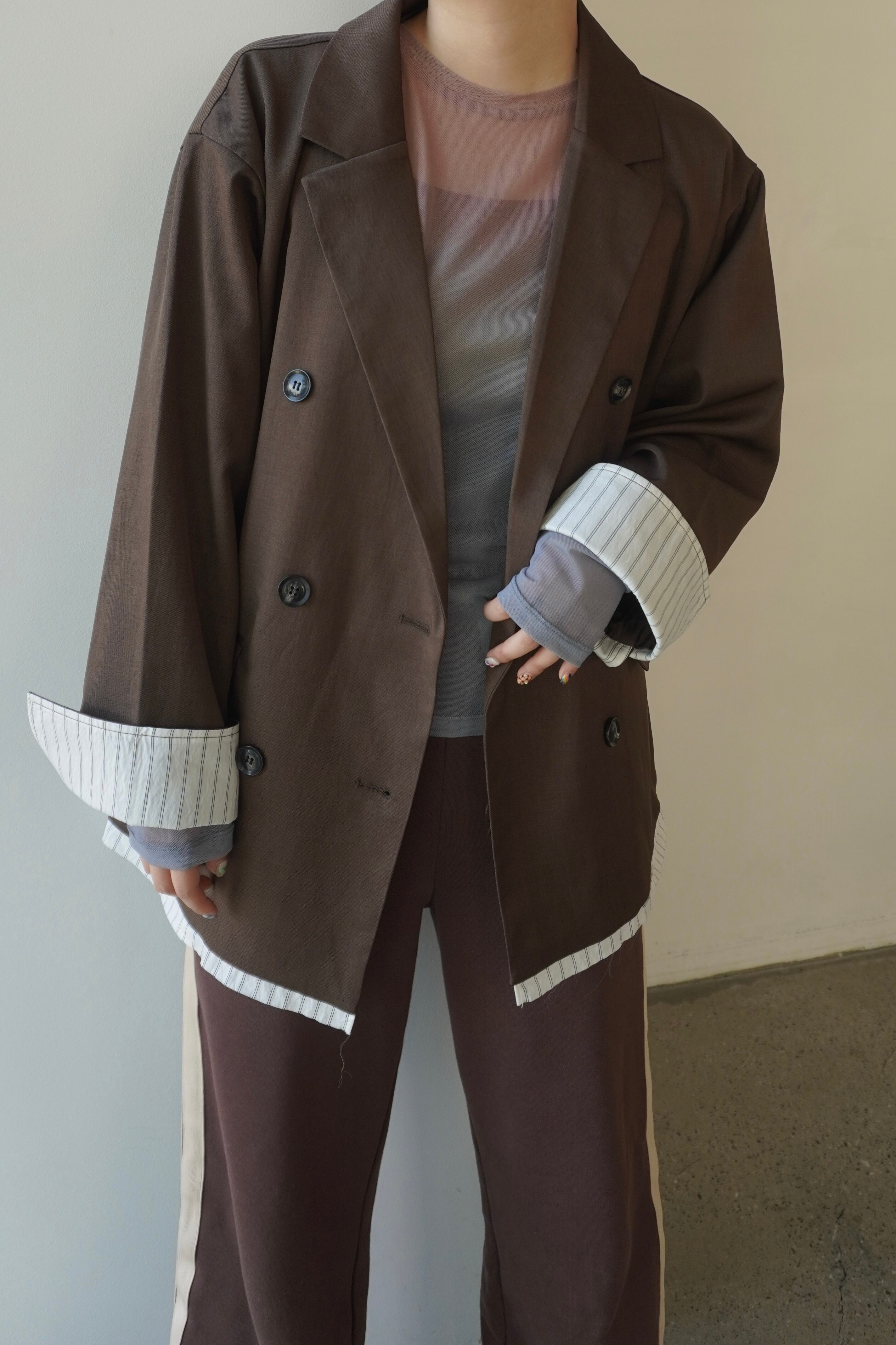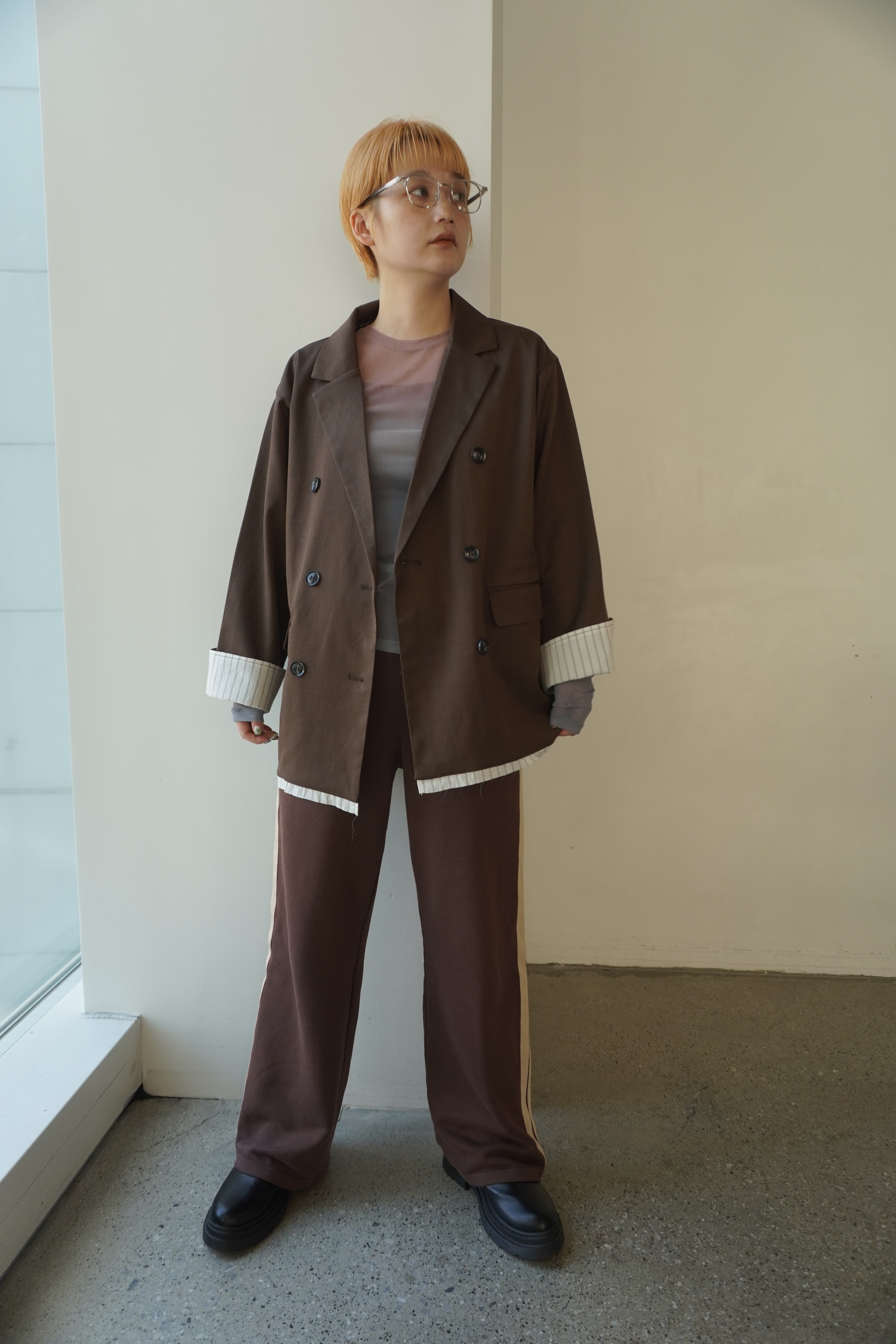 ハリがあり高見えするTRツイル素材と大人っぽく見せながらストライプのレイヤード風デザインが程よくカジュアルにも見せてくれるアイテム✨