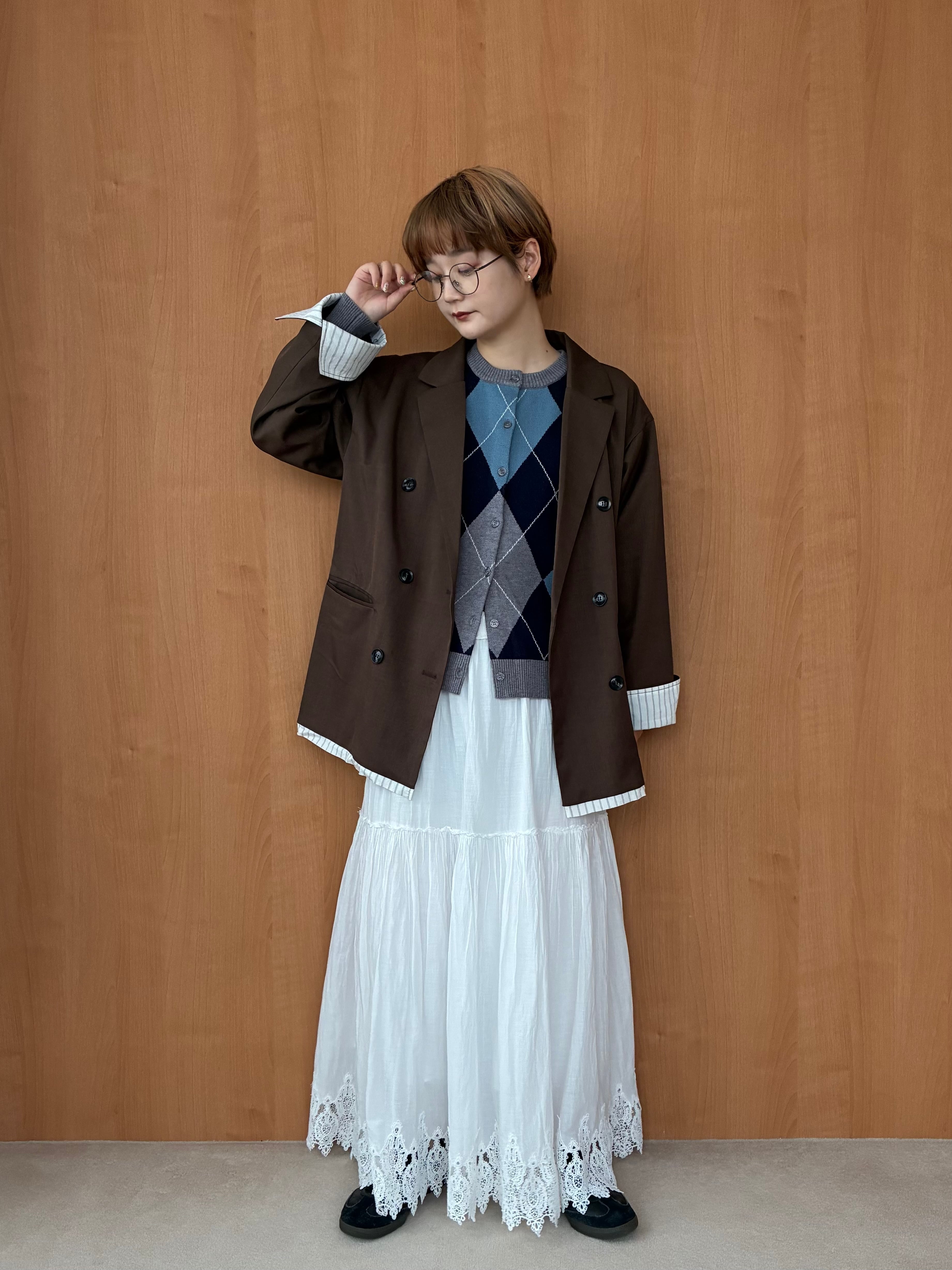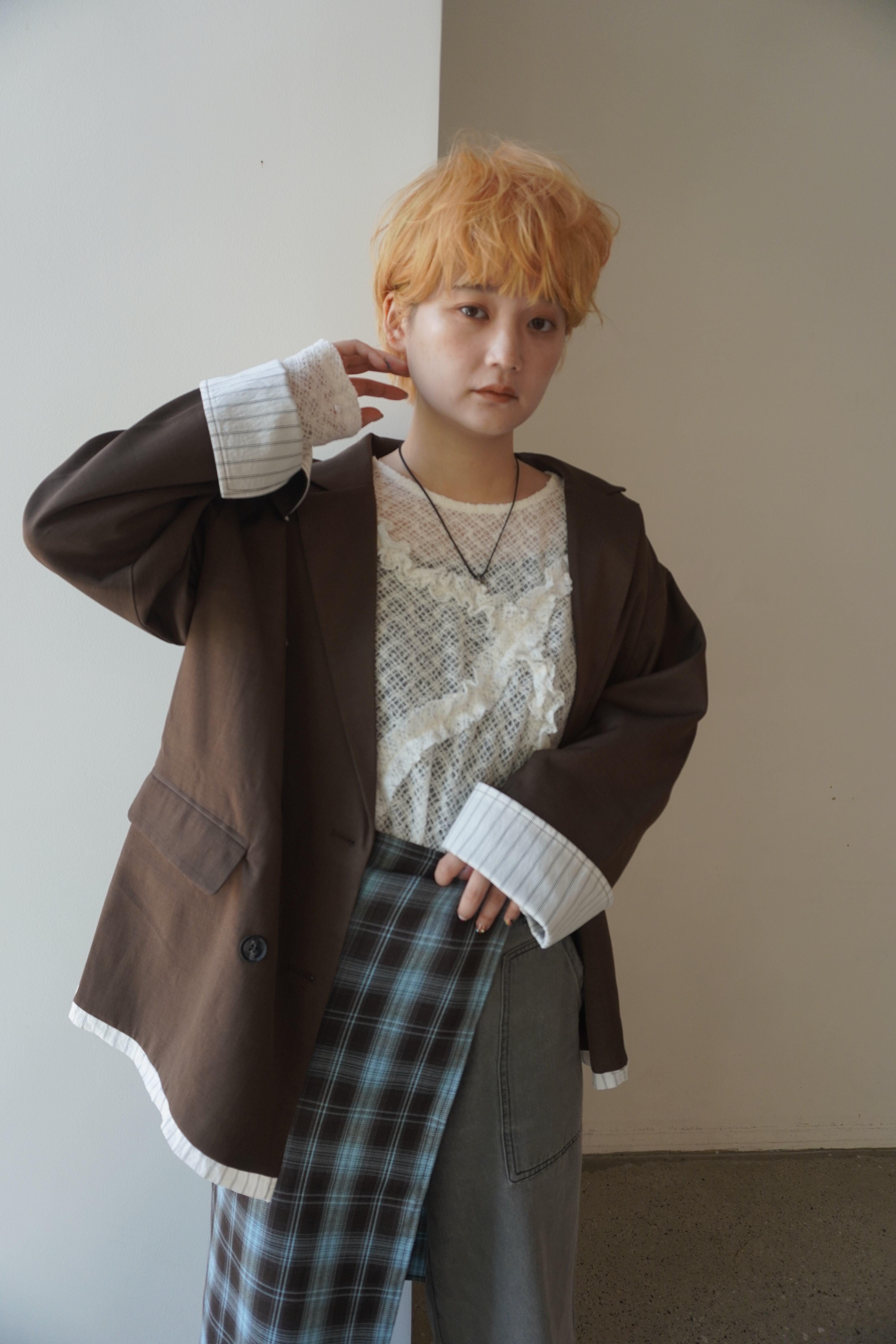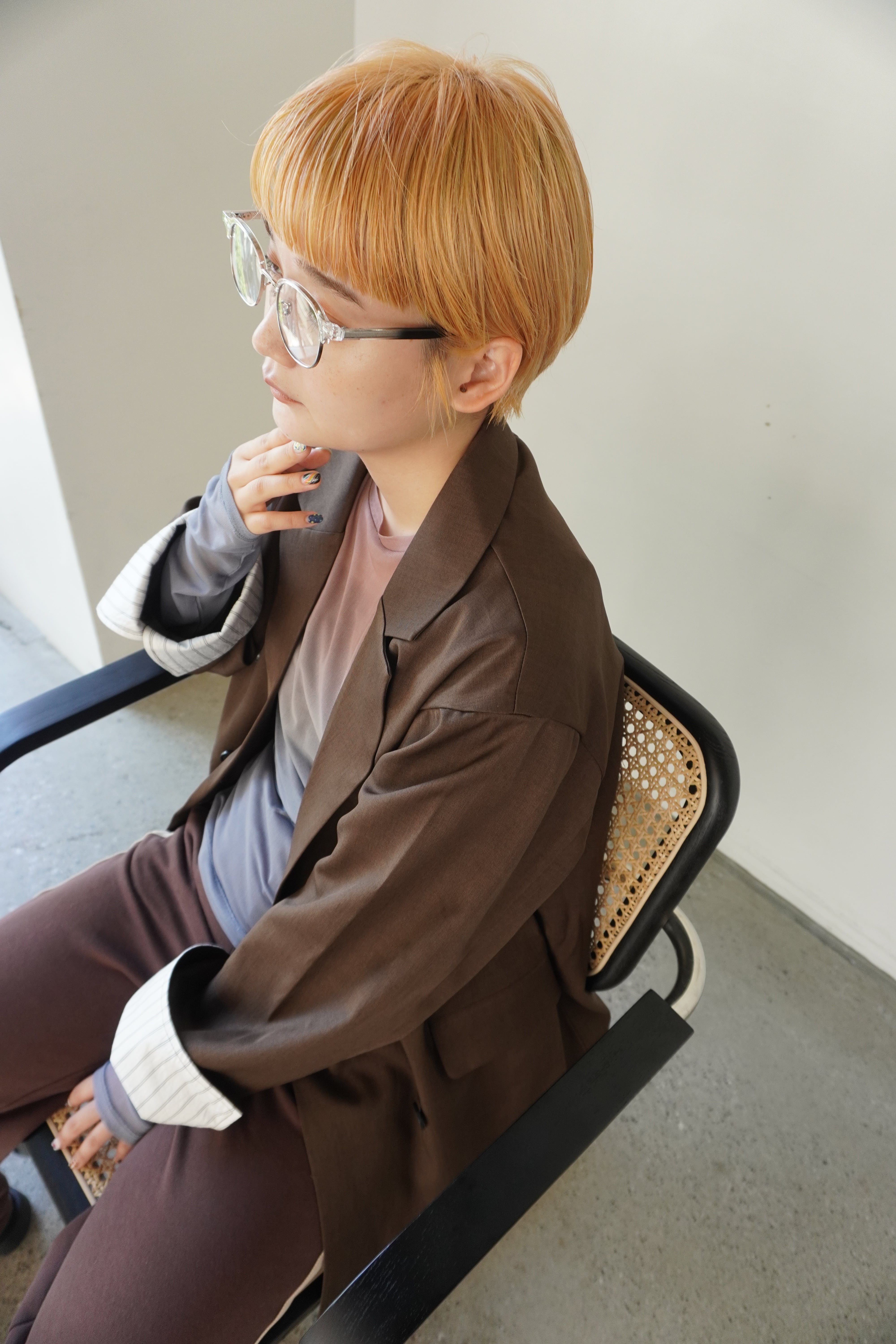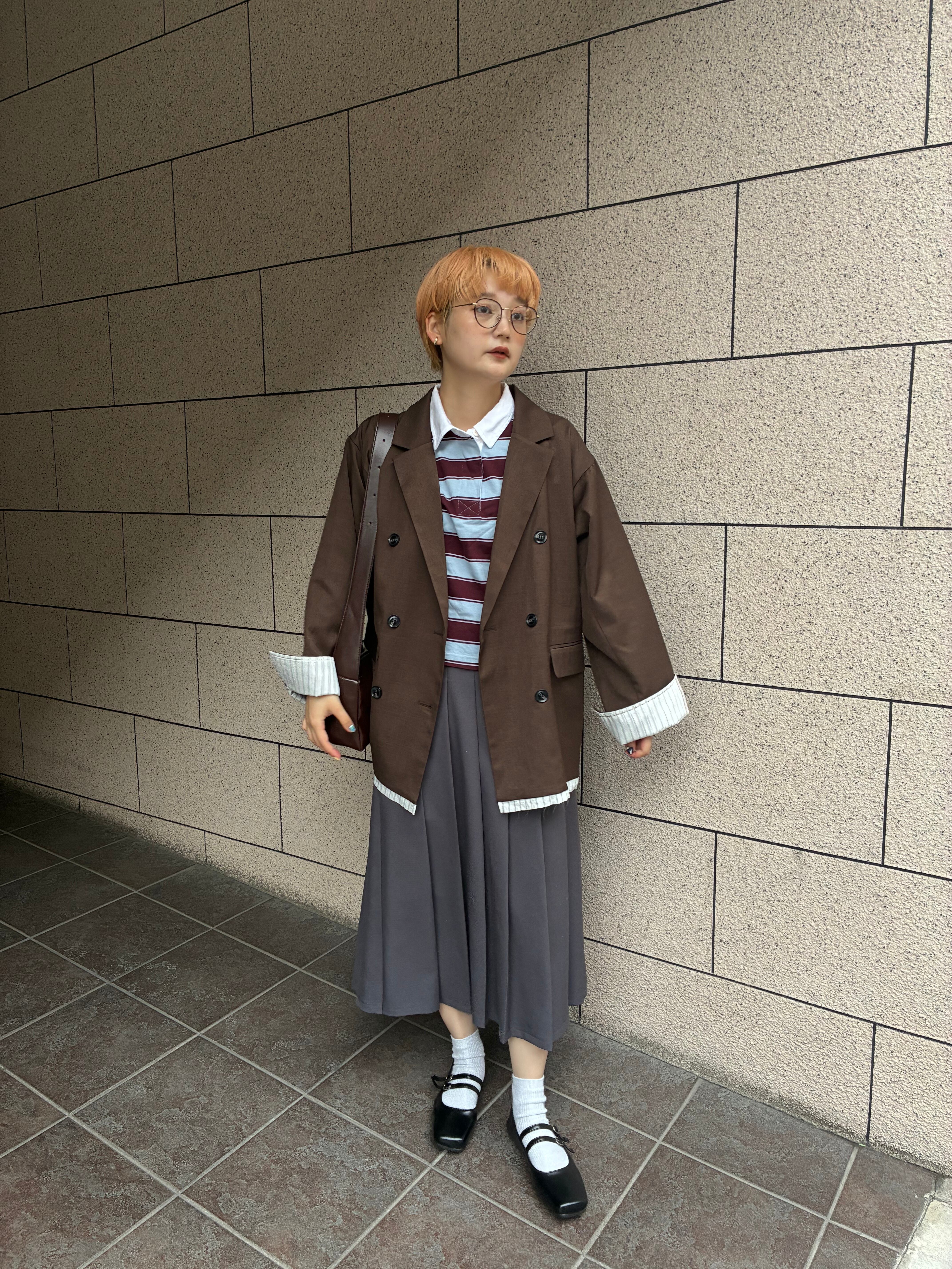 ハリがあり高見えするTRツイル素材と大人っぽく見せながらストライプのレイヤード風デザインが程よくカジュアルにも見せてくれるアイテム✨