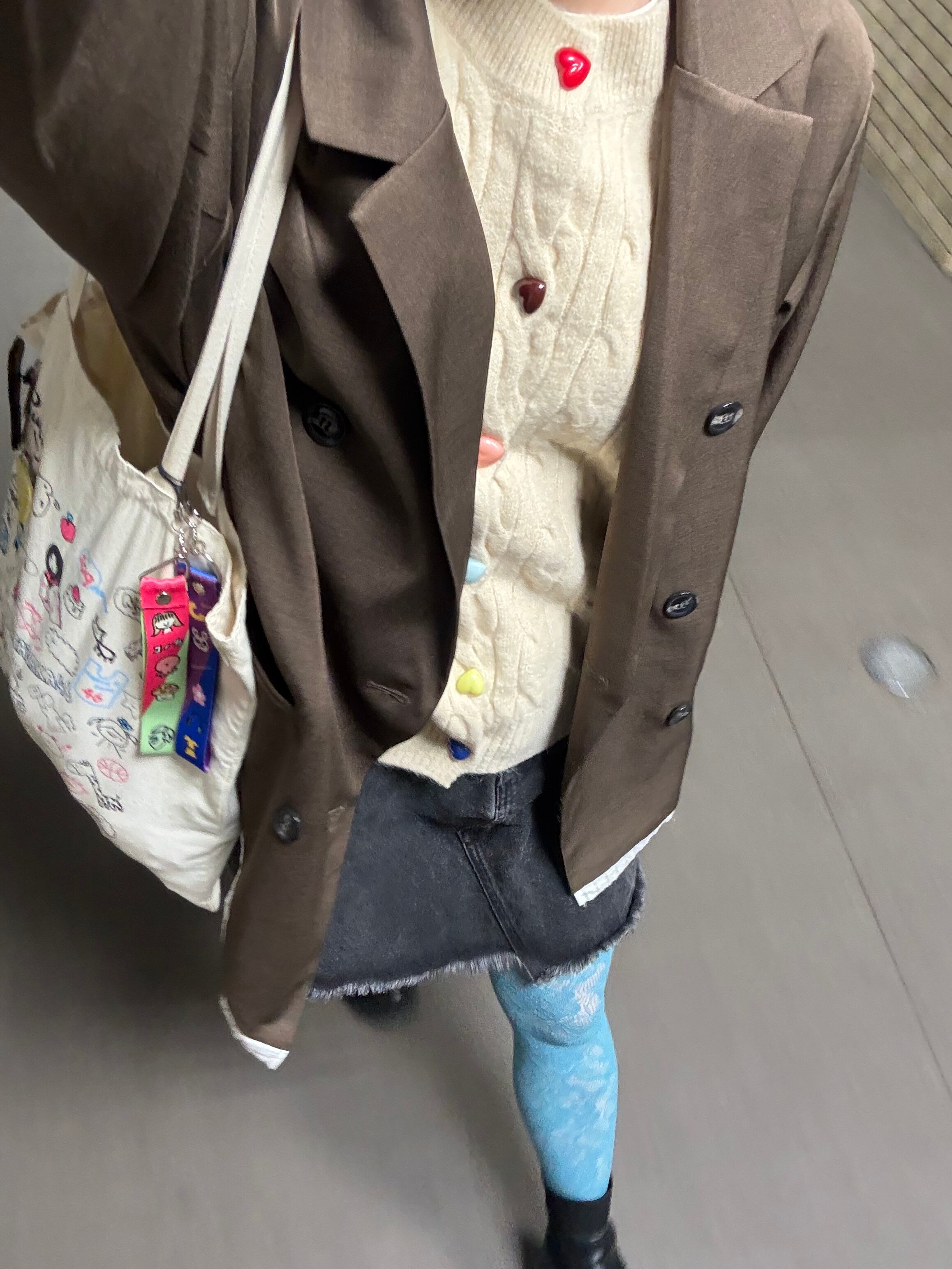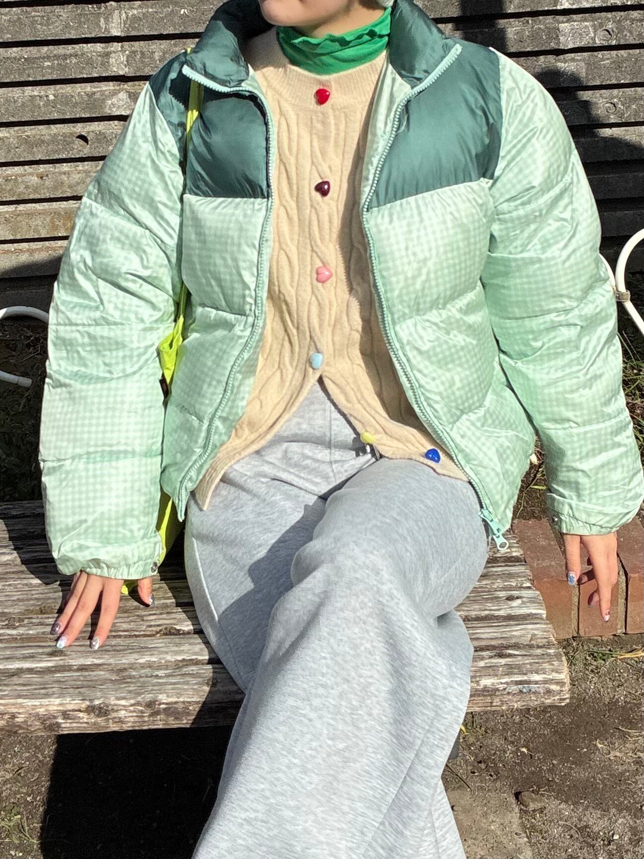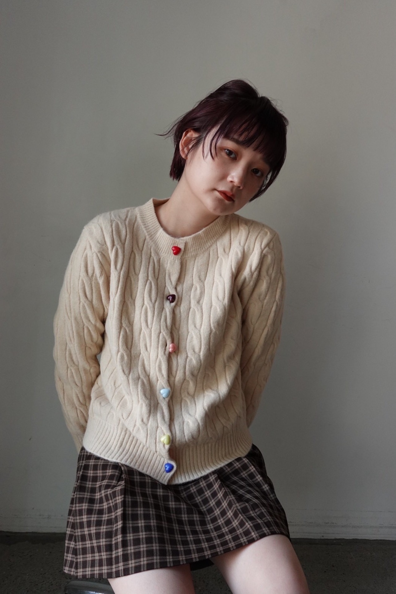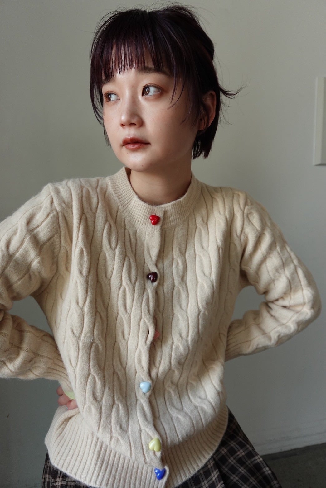 ハートのカラフルボタンがアクセントになり、女の子らしいスタイルに。