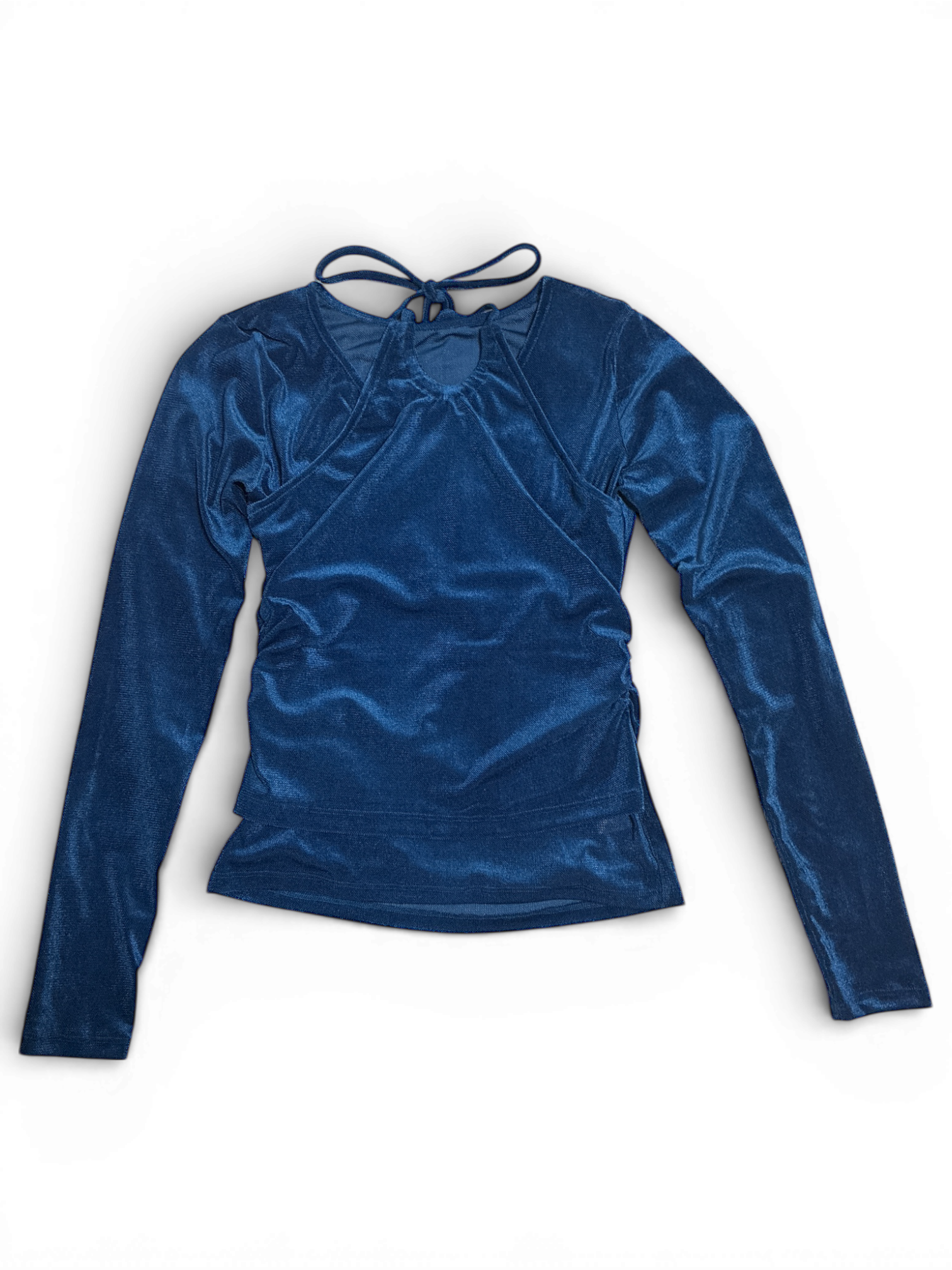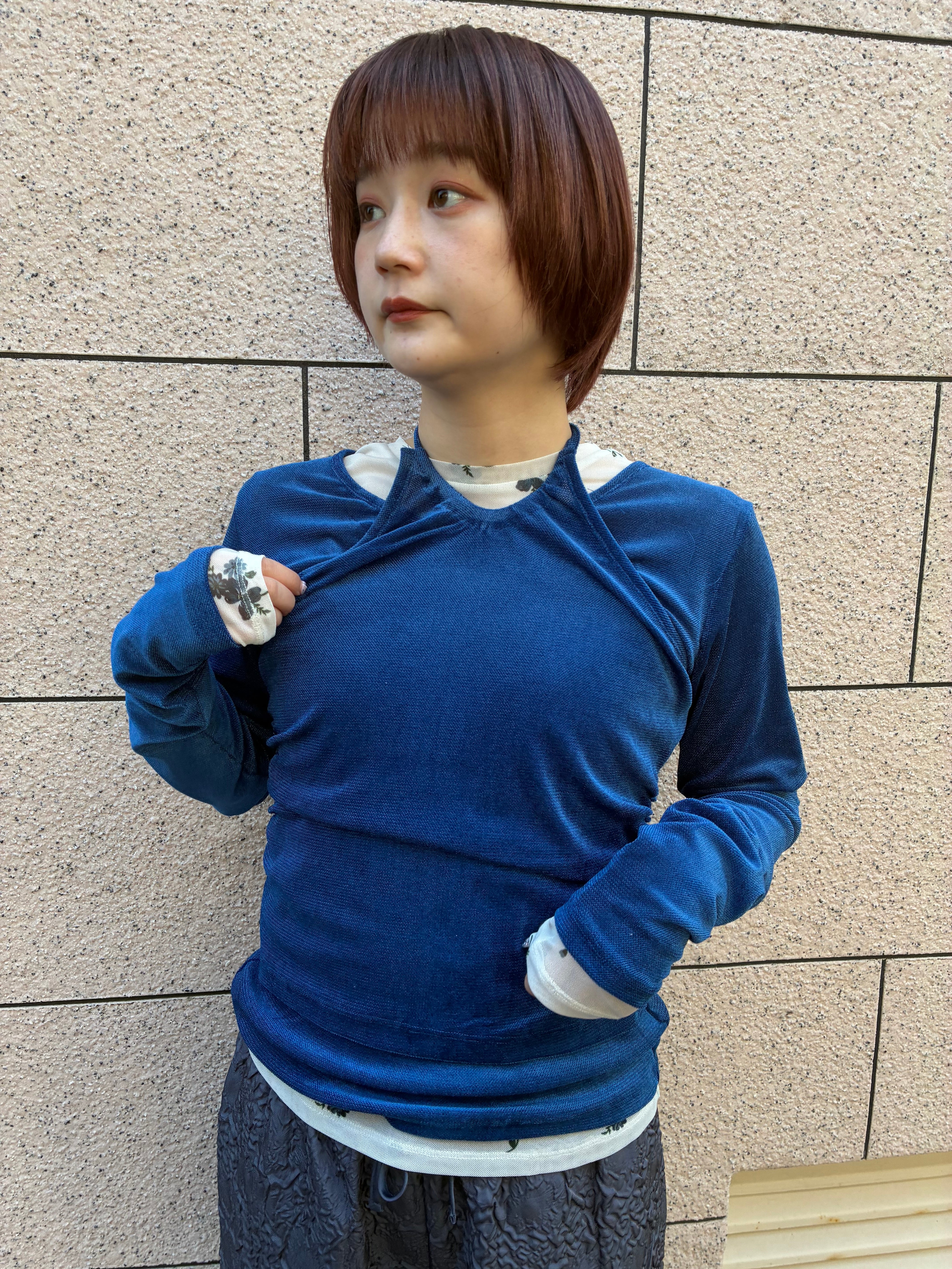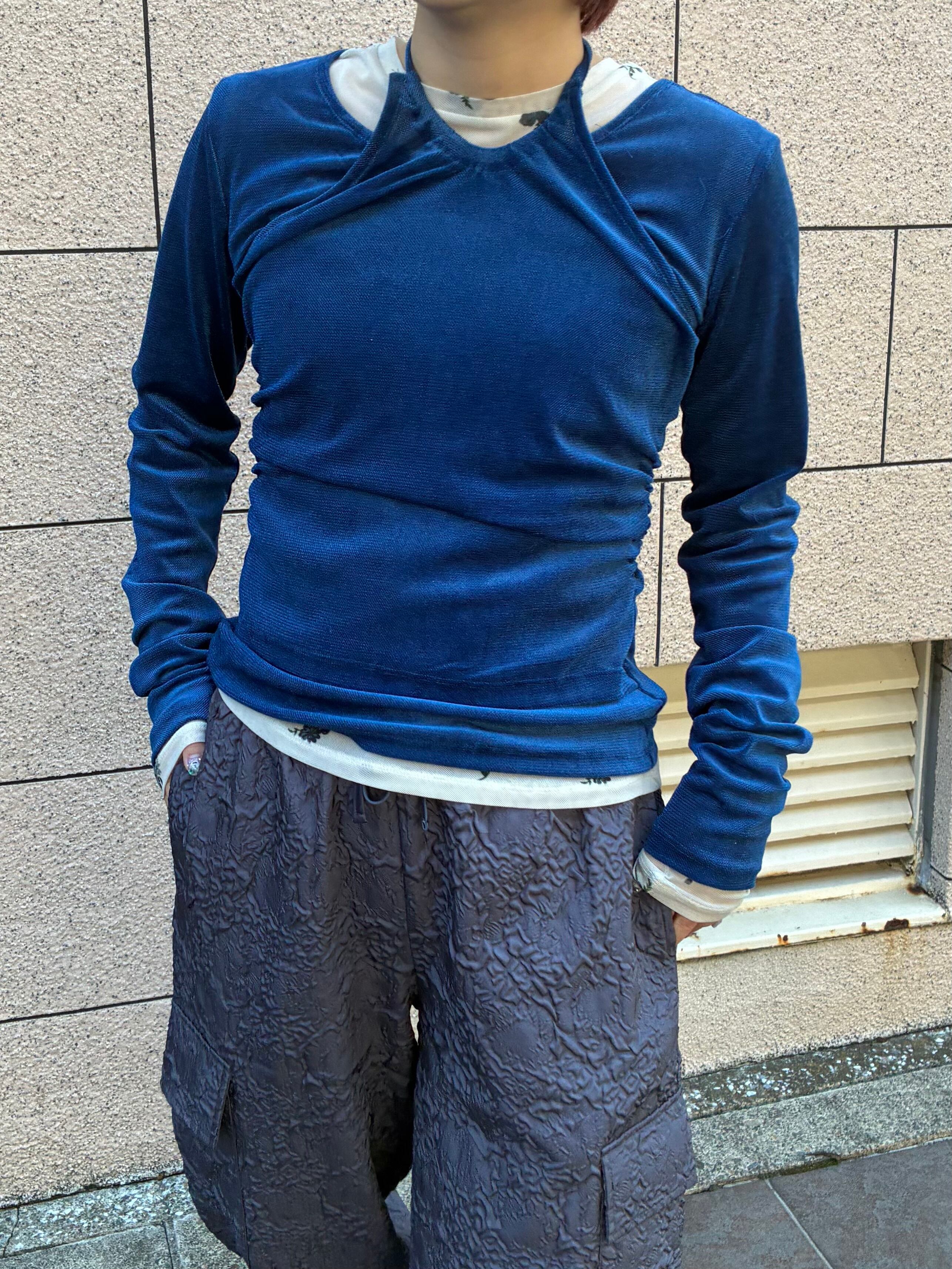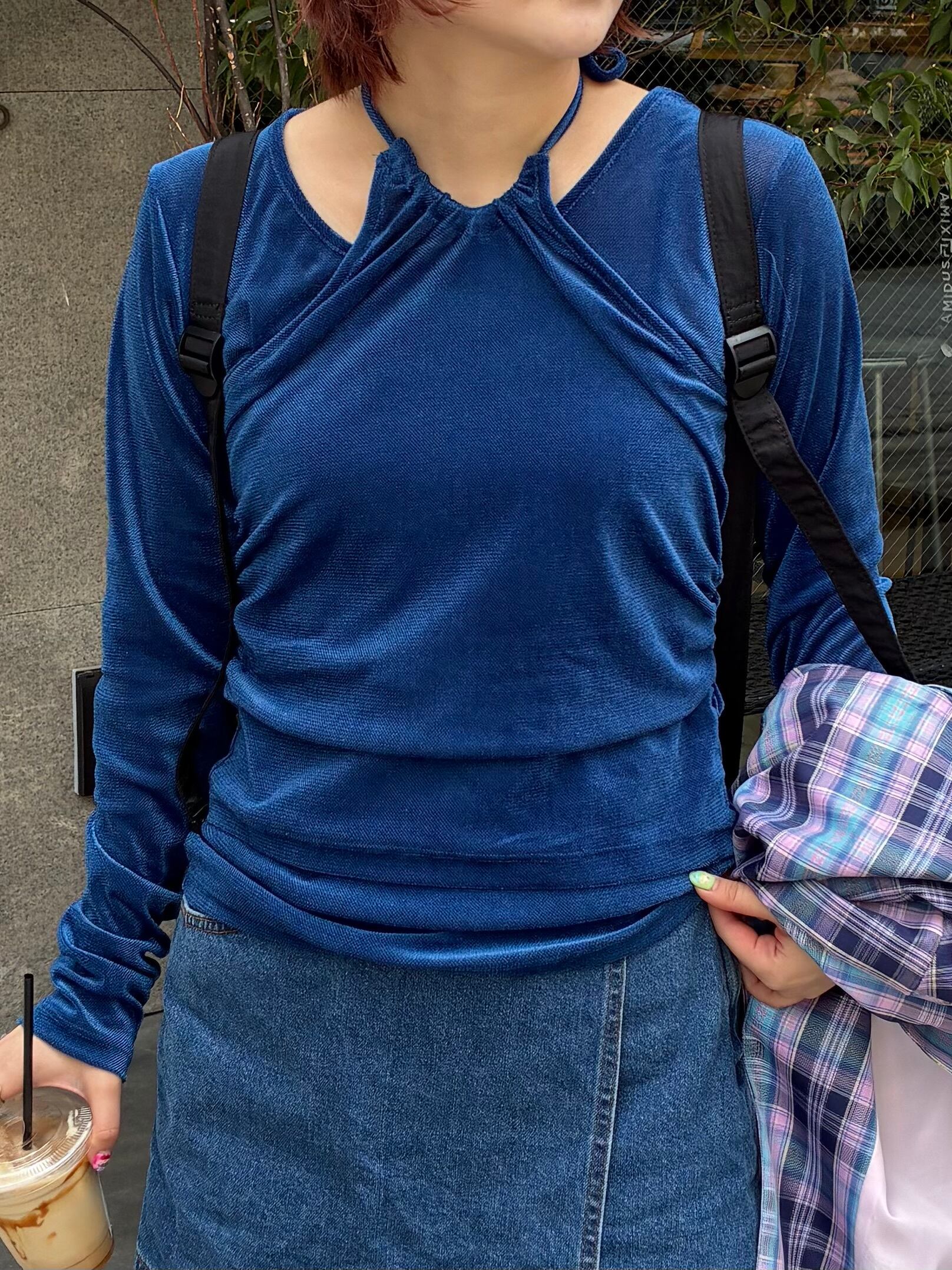 首元にホルターネックをレイヤードしたような、エッジの効いたデザインが目を惹くデザイントップスです。計算されたデコルテの開きが、ヘルシーな色気と洗練されたモード感を演出します。