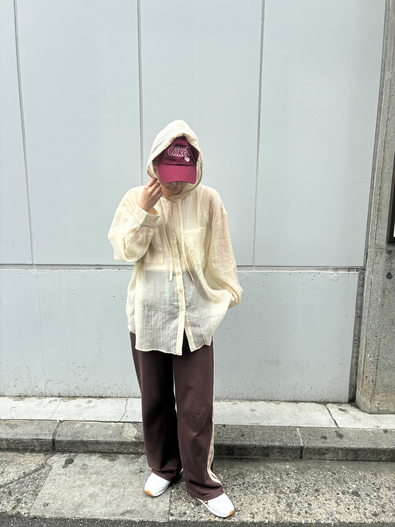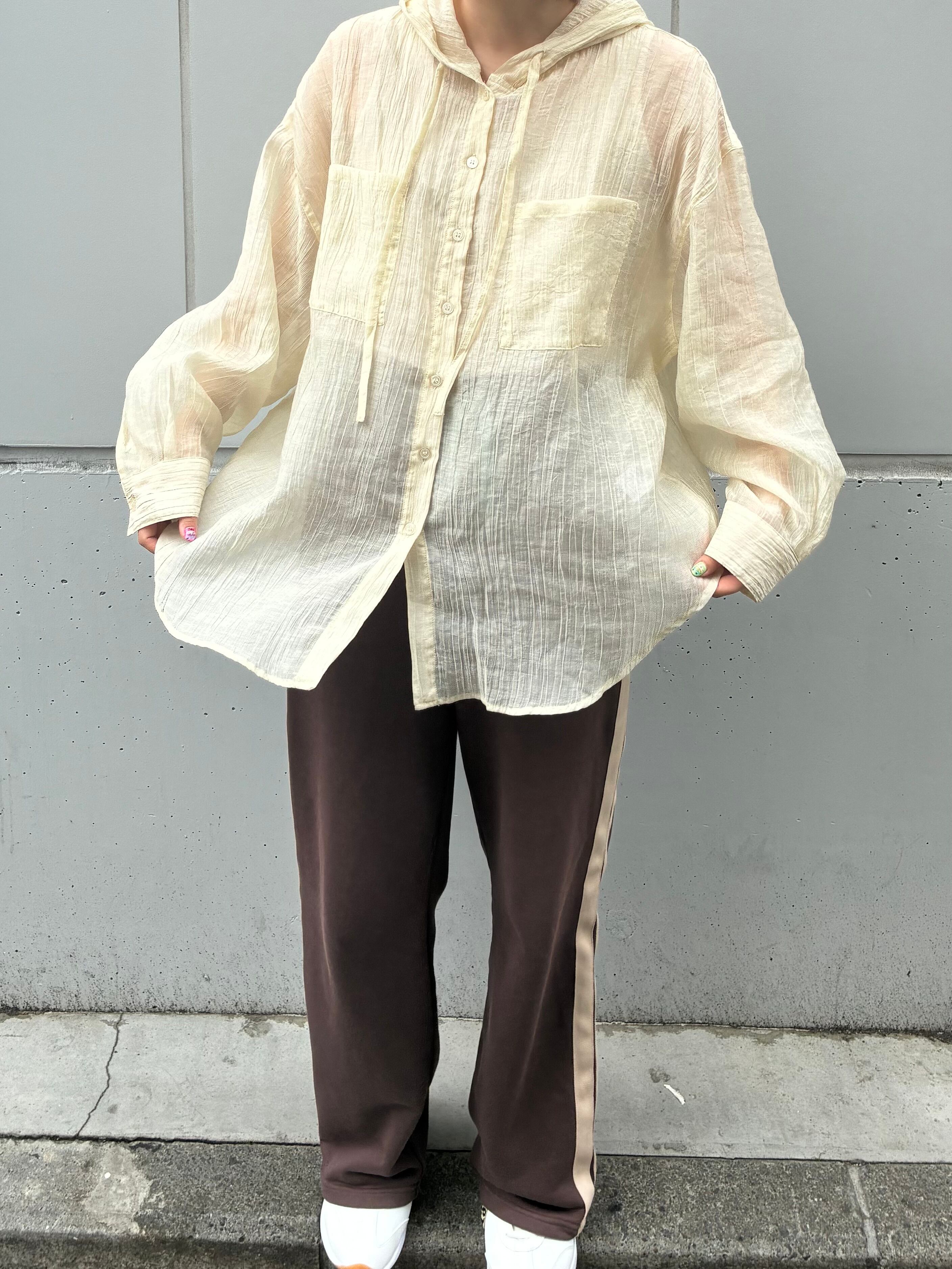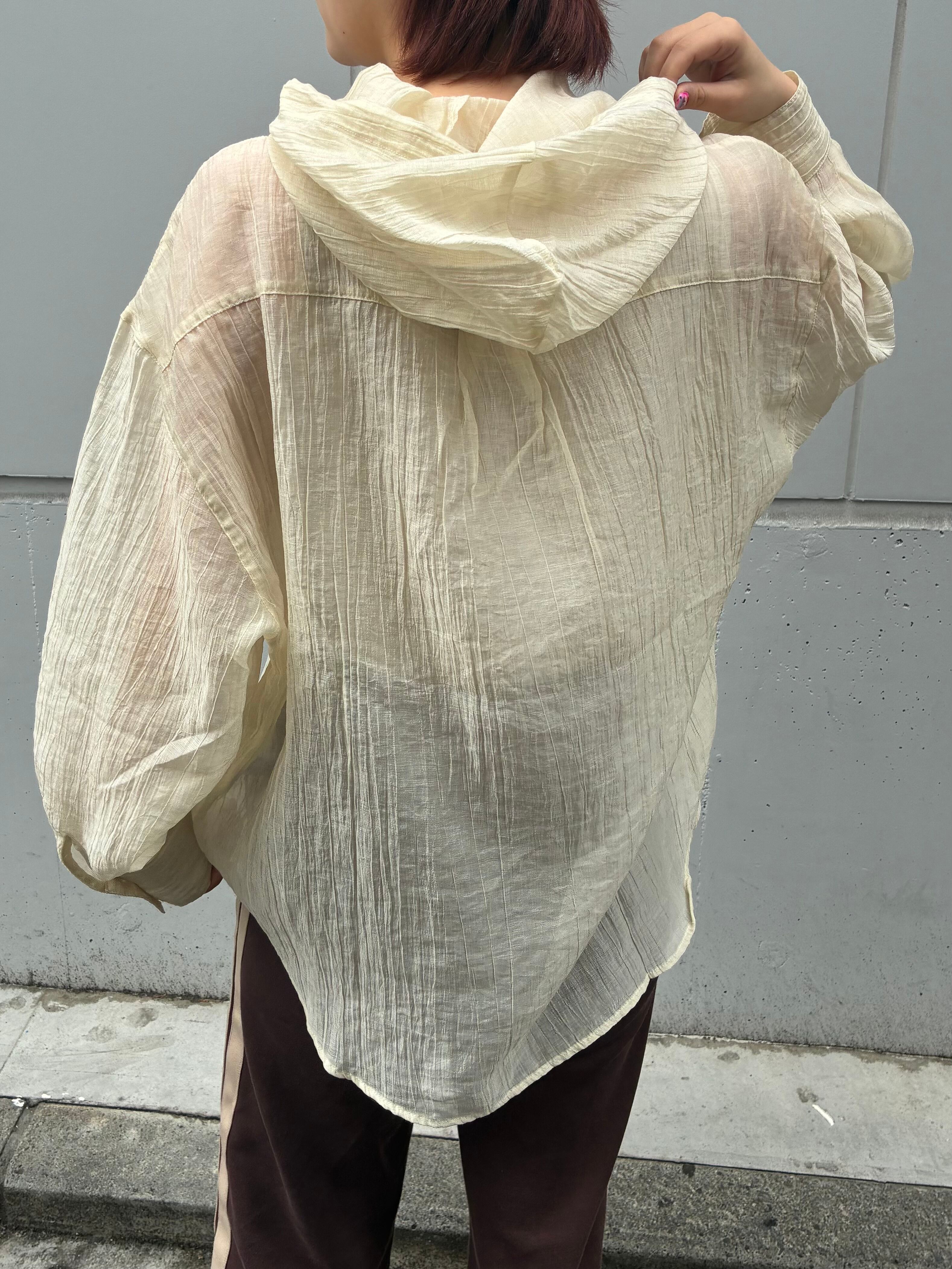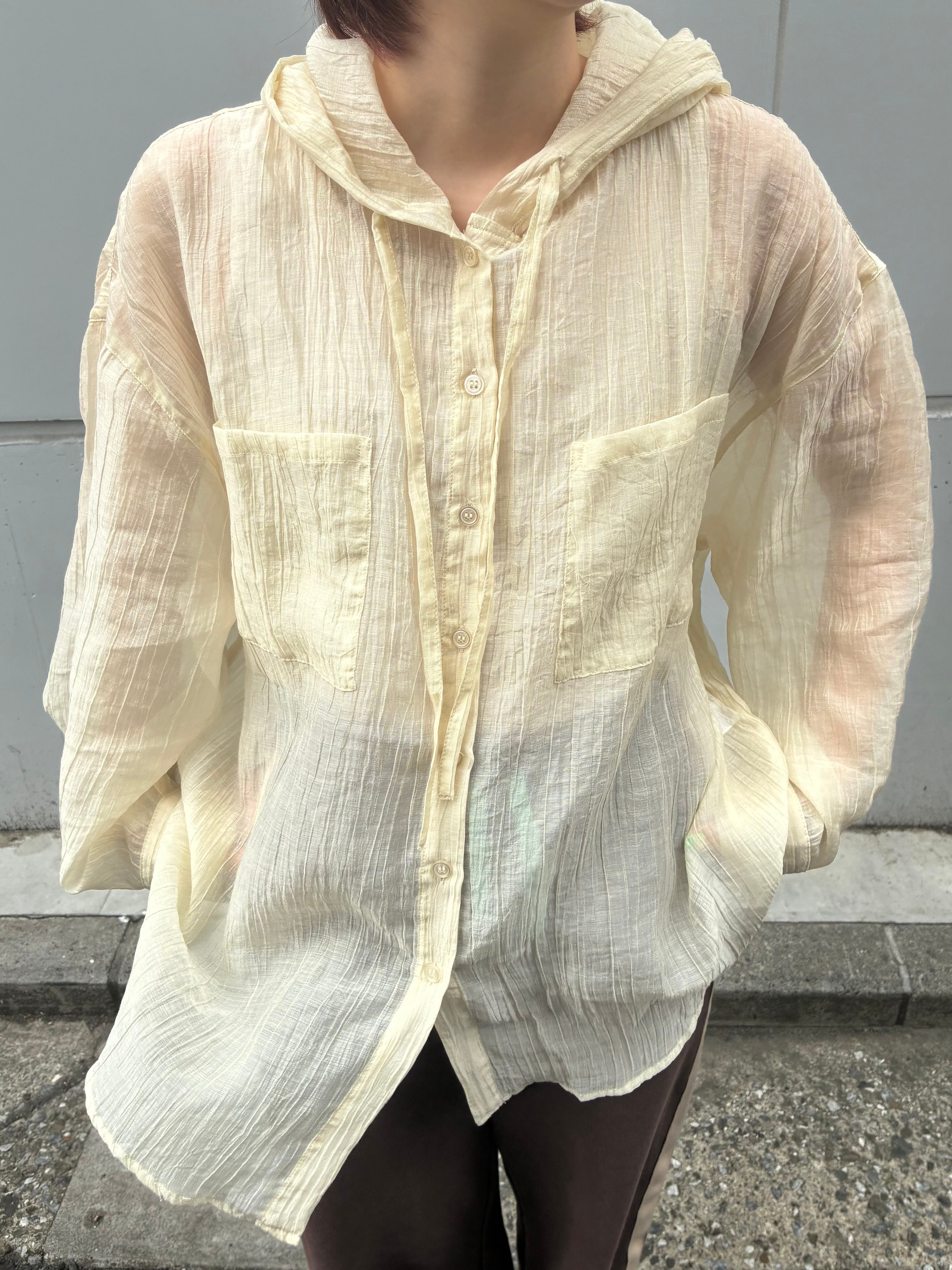 表面感のあるクリンクルシアー素材を使用した、フード付きビッグシャツ