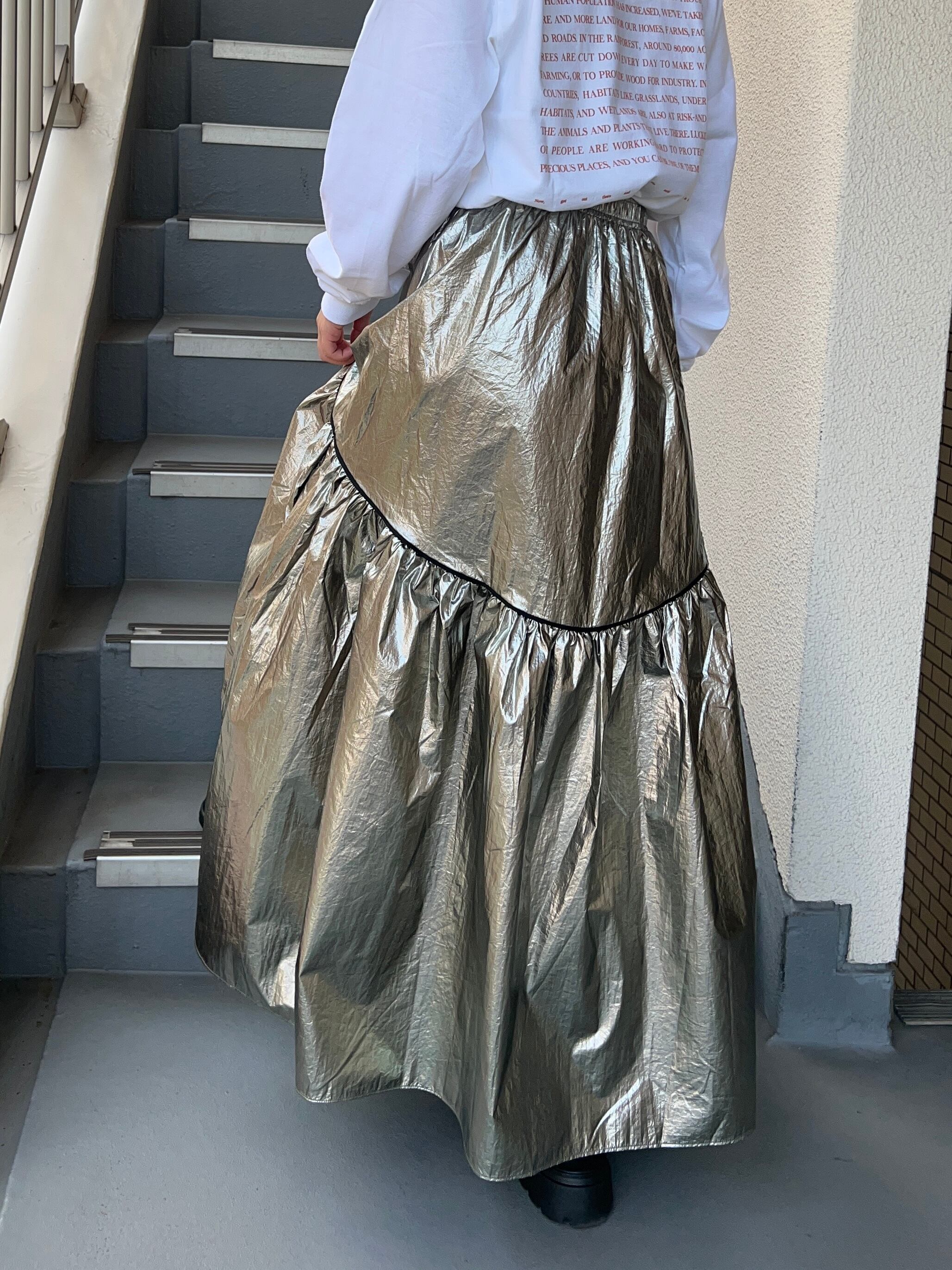 シャイニーなメタルカラーが目を引くボリュームたっぷりのギャザースカート。