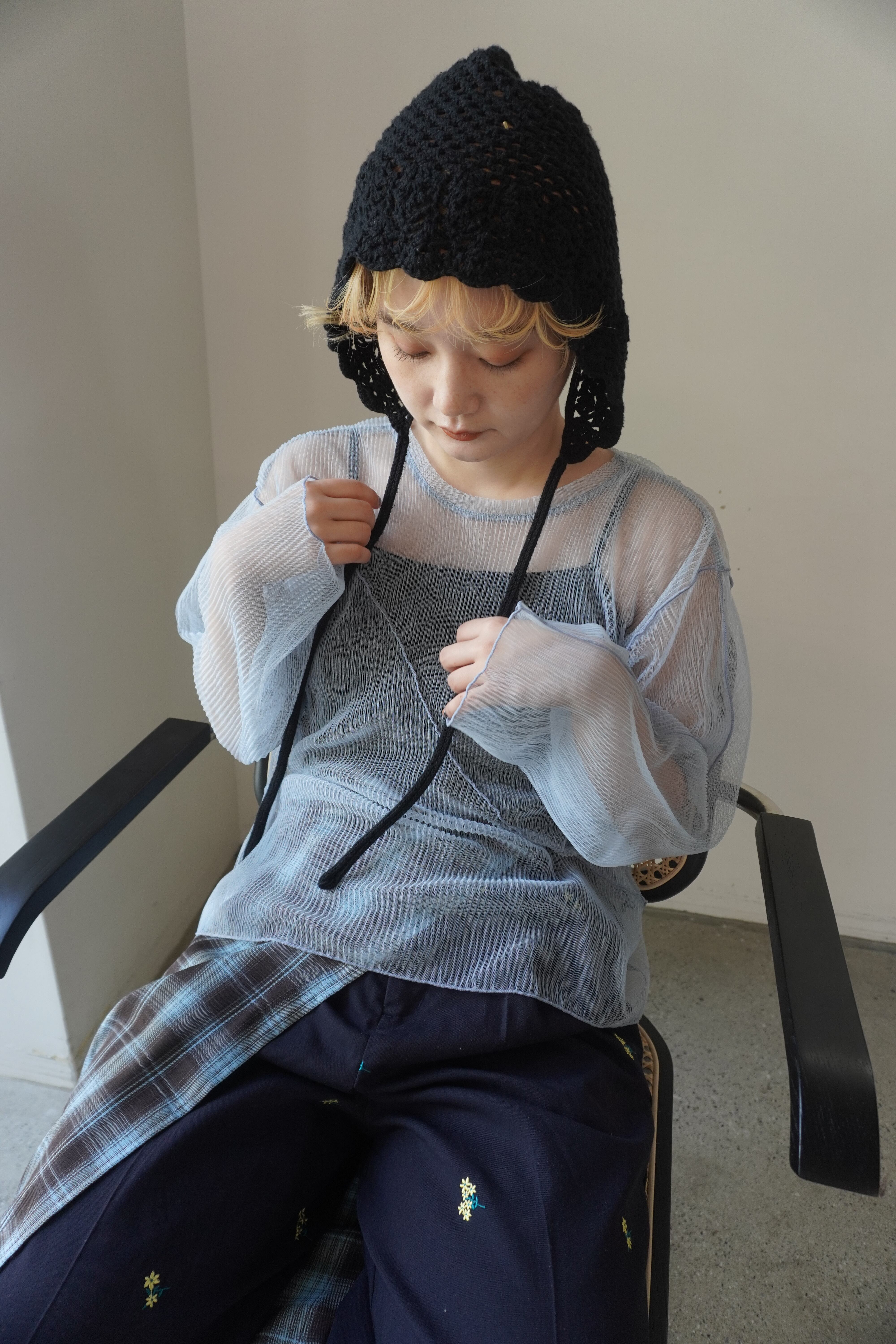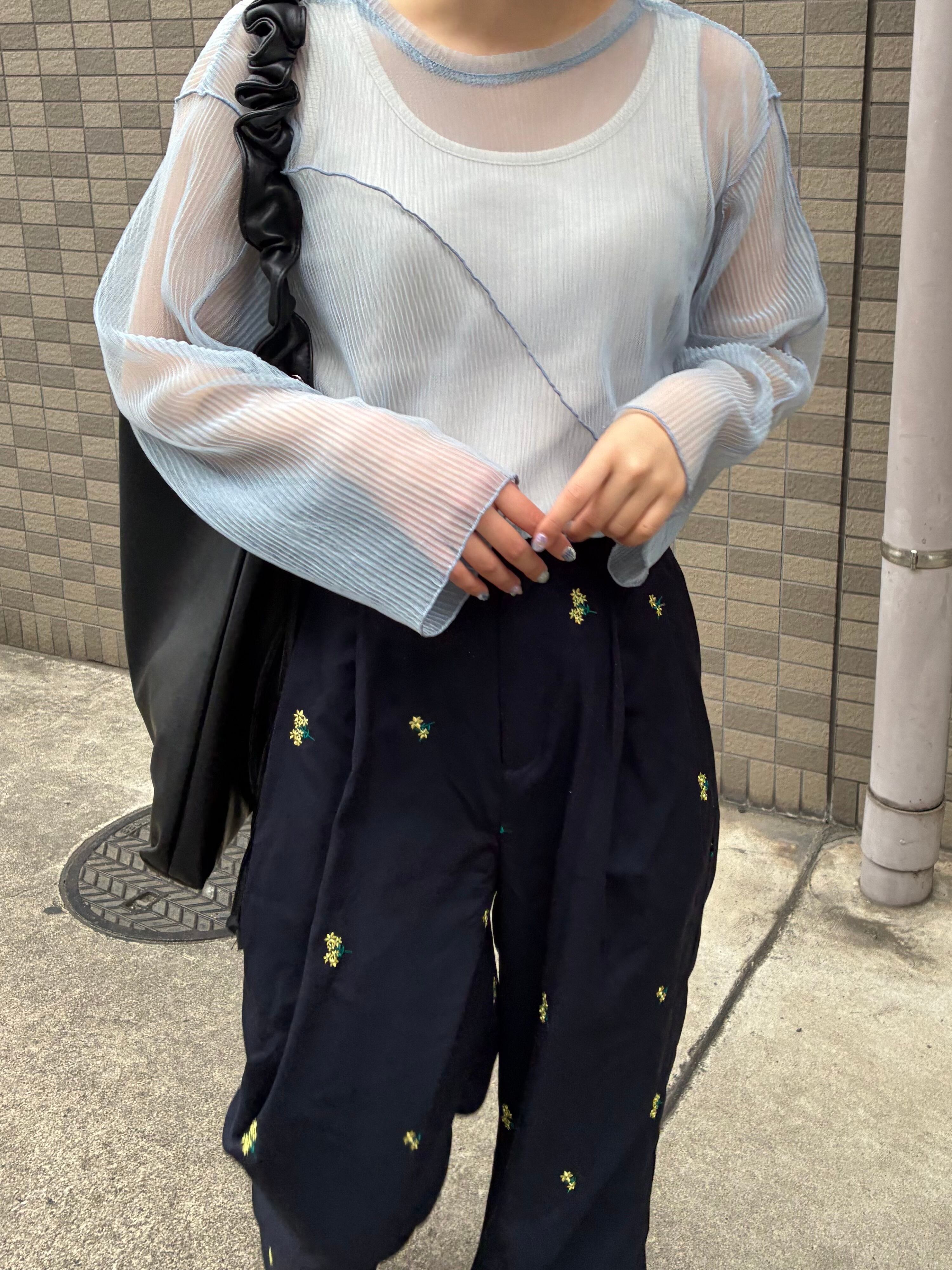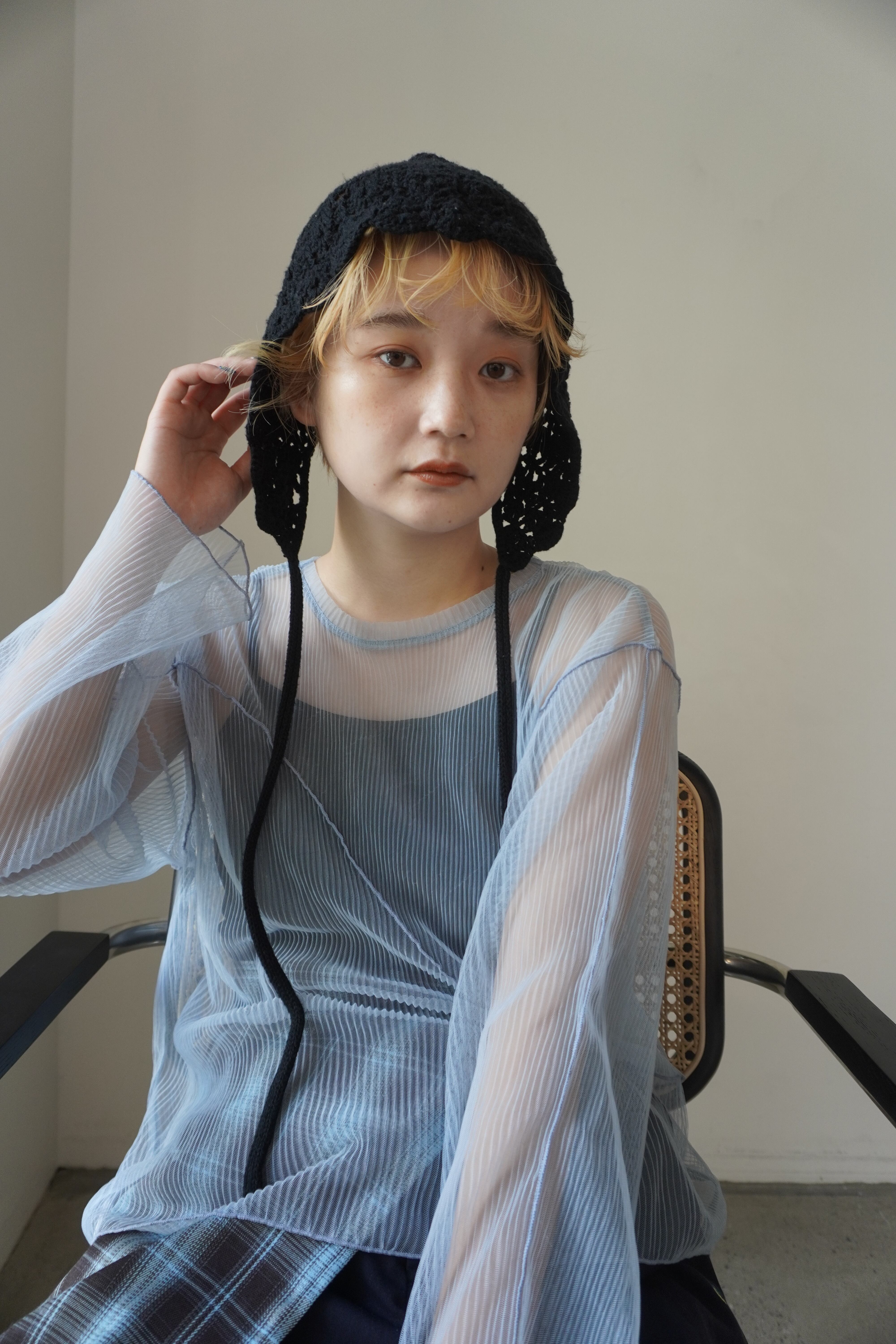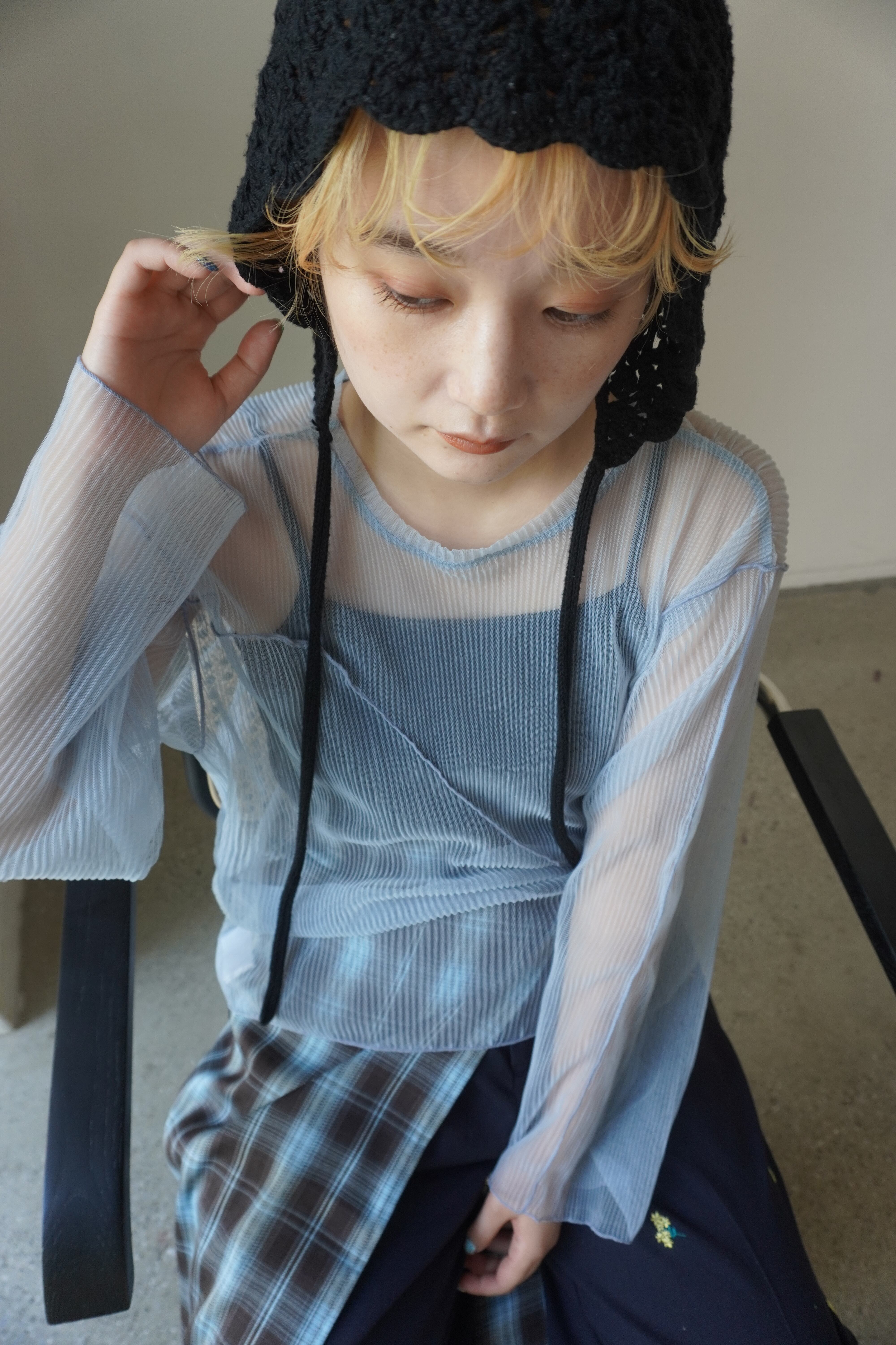 ニュアンス感のあるアシンメトリーのメロウデザインと、クラシックな印象を与えるフロントボタンの前後2WAYでお召し頂けるシアートップスの登場です。ボタンをすべて開けるとカーディガンとしてお召し頂けます。細いプリーツ加工が施された表面感のある生地で、初夏にぴったりの透明感のあるシアー加減がシーズンムードを引き立てます。緩めのサイジングで抜け感も演出できる1枚です。