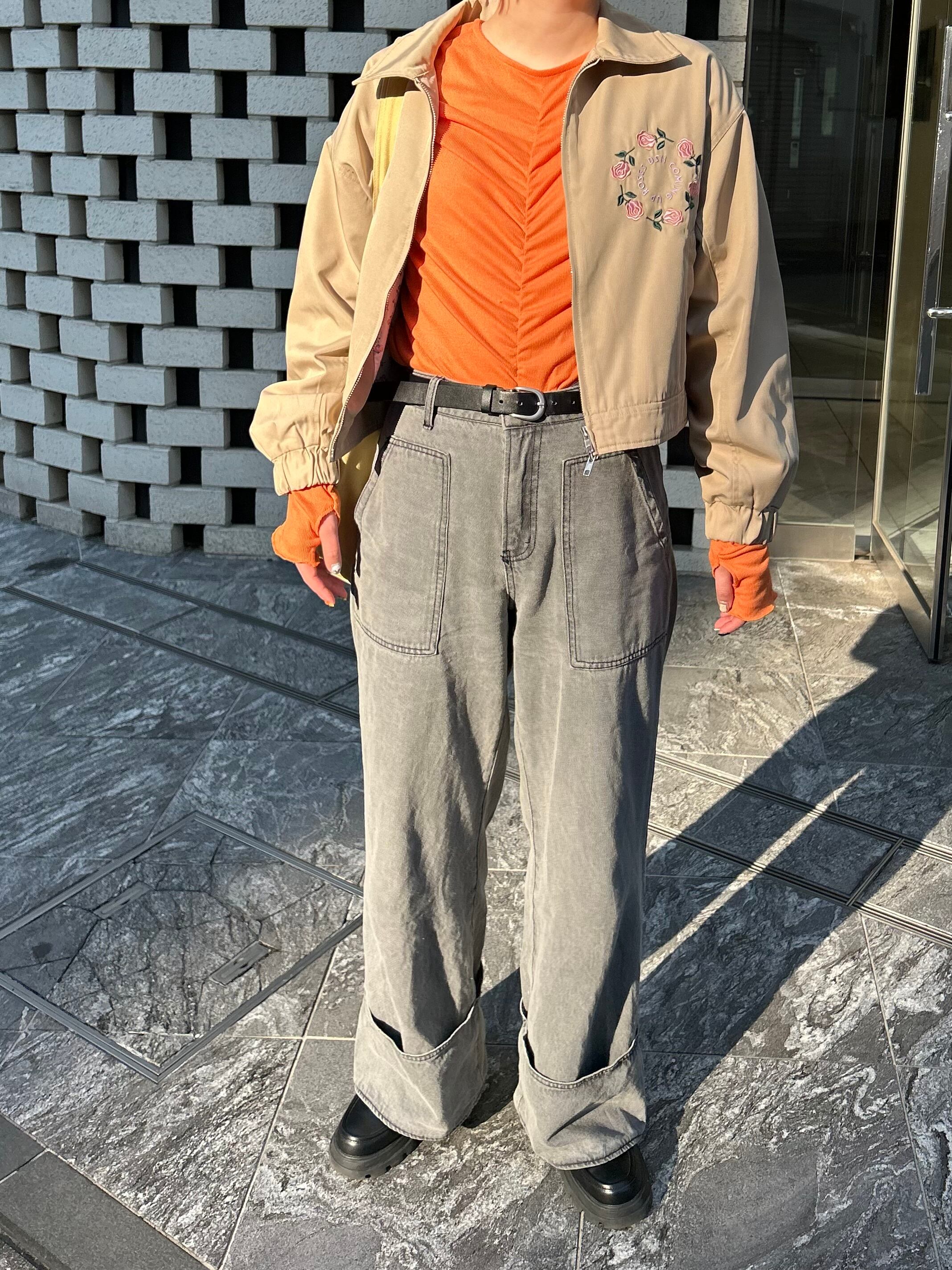 配色のステッチと裾の降り返しが特徴的なワイドパンツ。