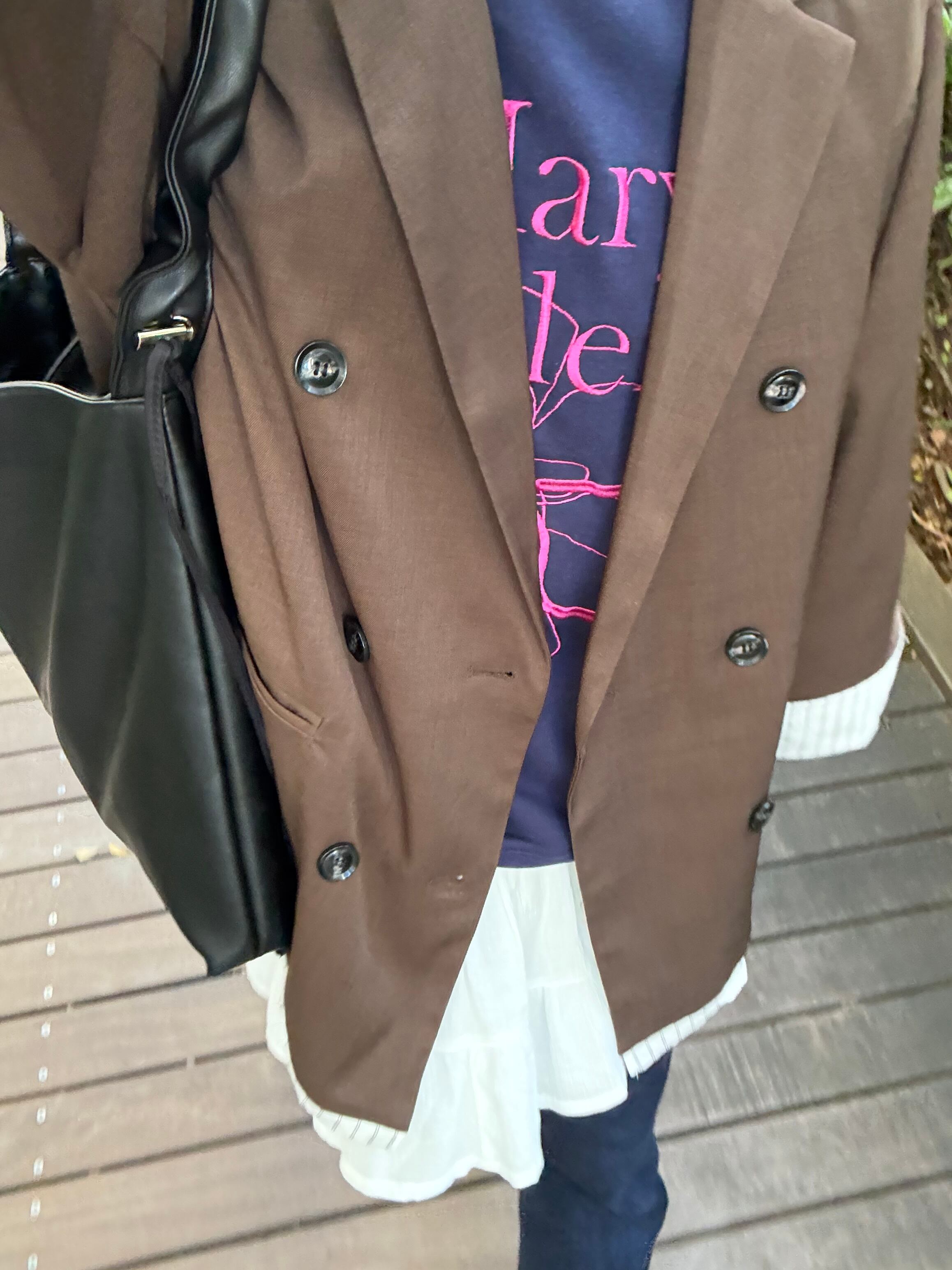 襟や袖、裾にあしらわれたリブがスタイリングにメリハリをプラス。