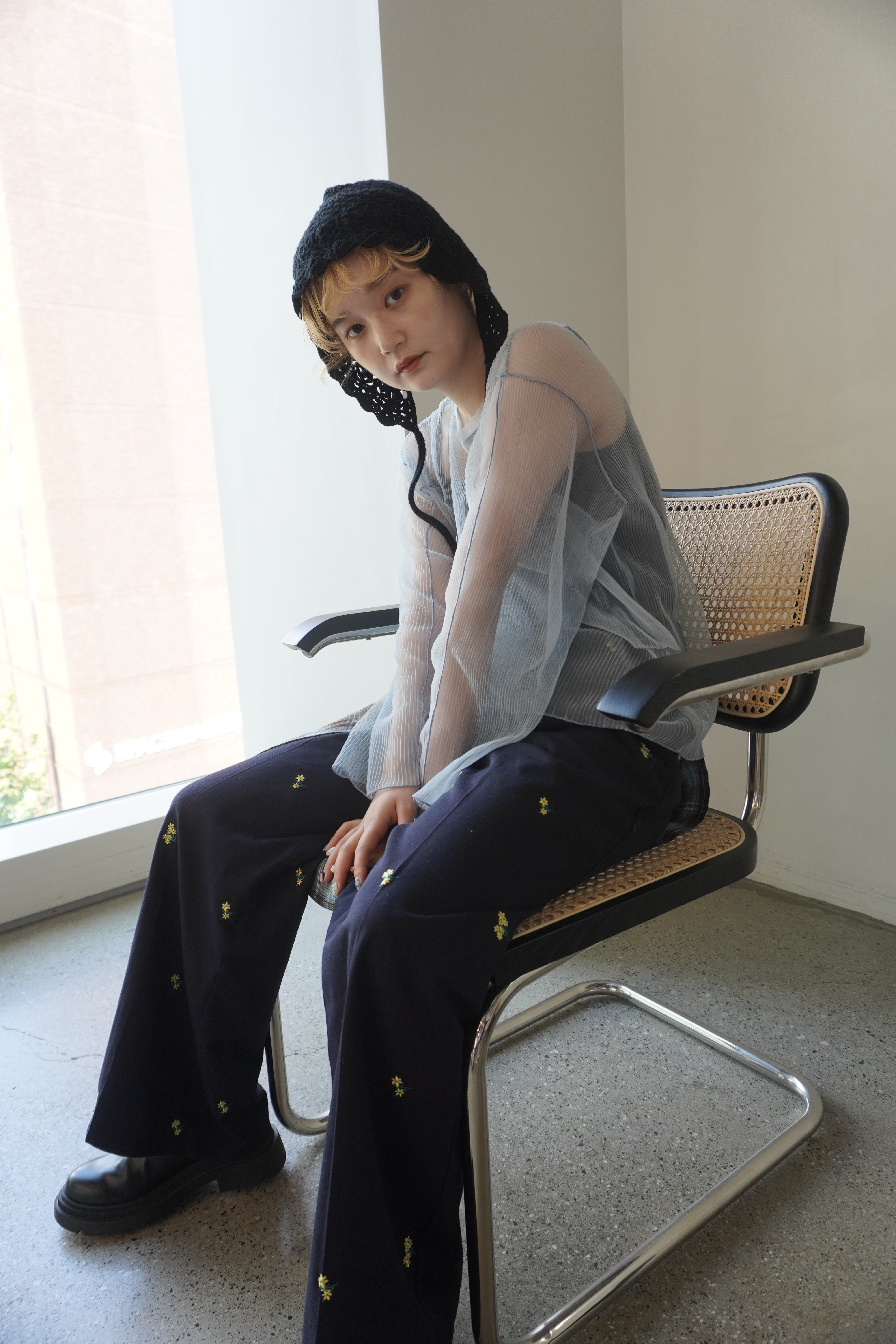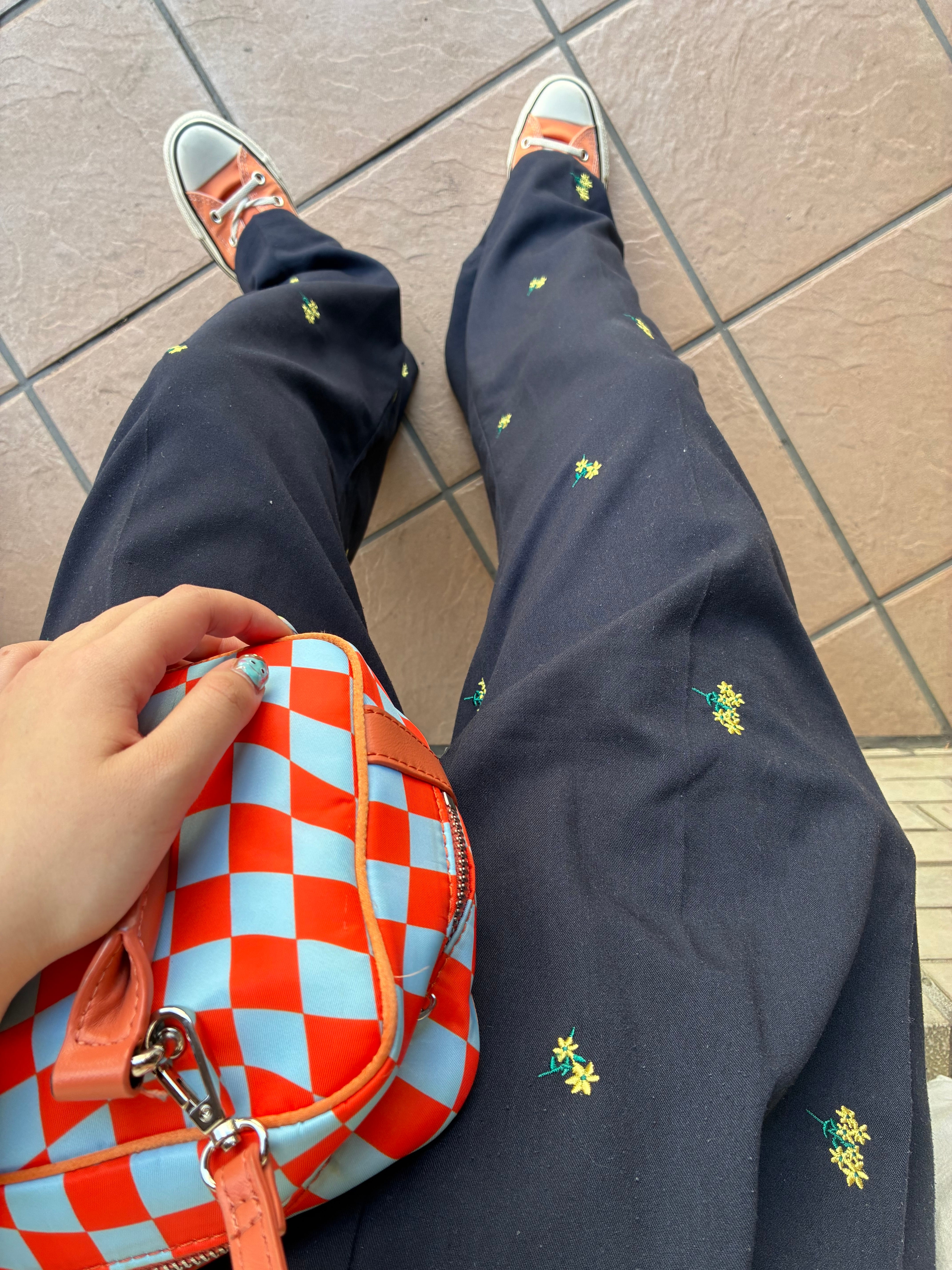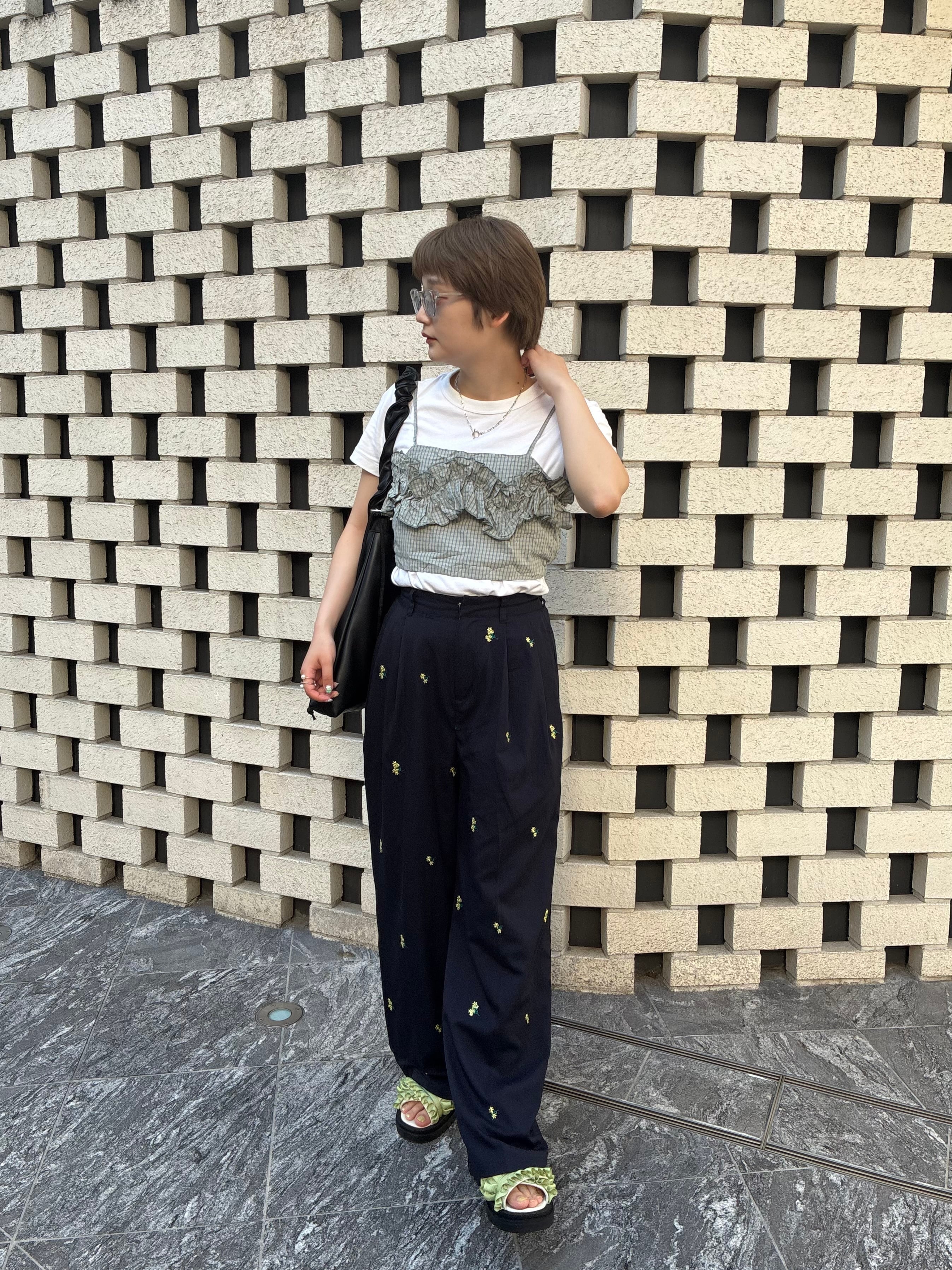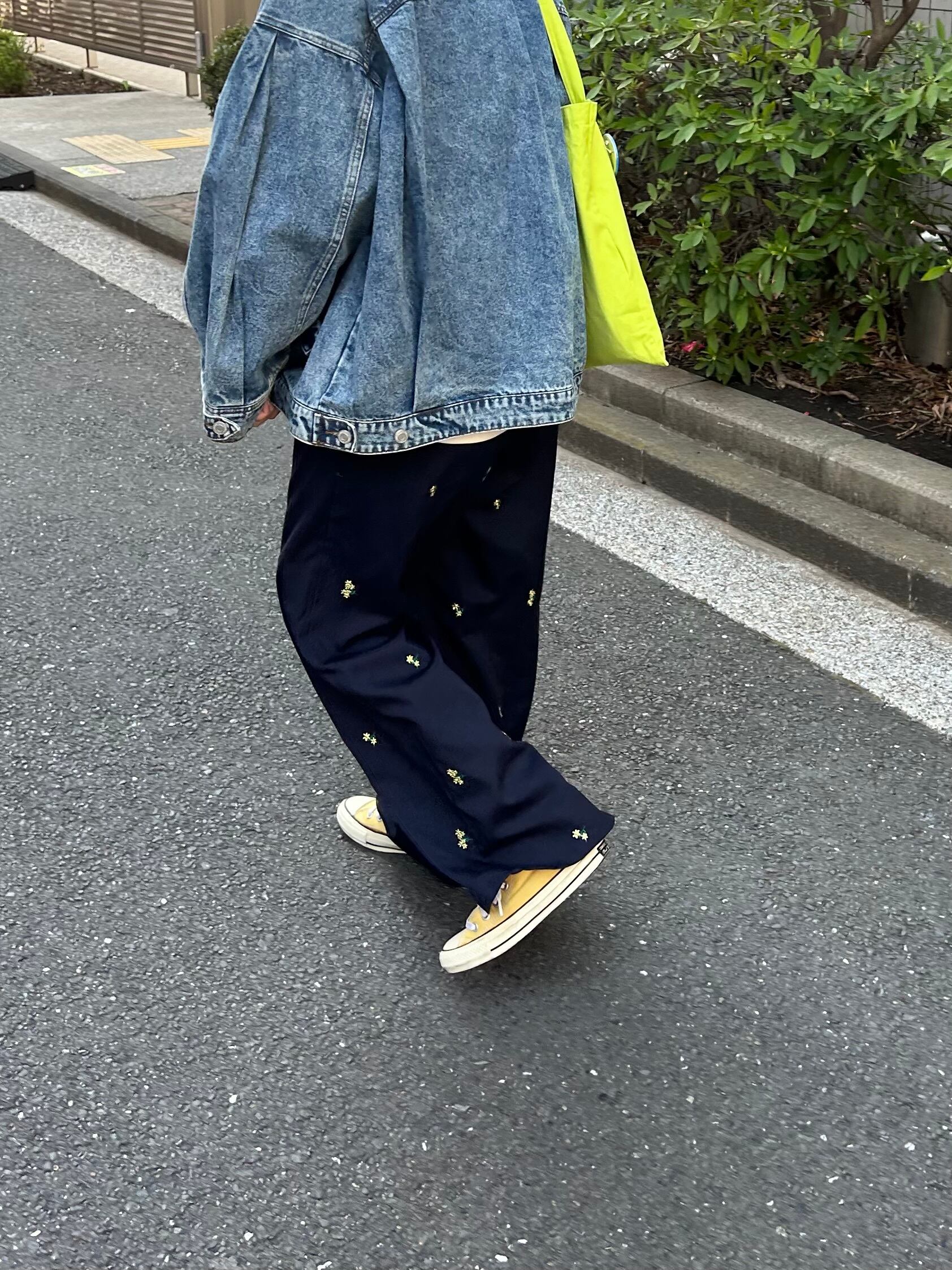 フラワー刺繍タックパンツ/ネイビー